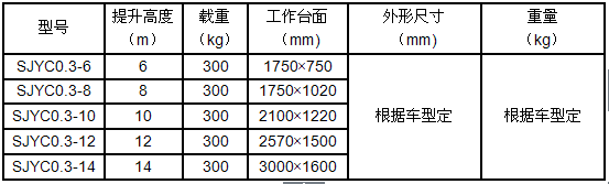 產(chǎn)品規(guī)格:車載式液壓升降平臺根據(jù)升降高度可分為:6、8、10、12、14米升降平臺,設備載重300公斤至500公斤。客戶可根據(jù)需求選用解放、東風、輕騎、福田、電瓶車等任何車型,設備直接采用汽車或電瓶的直接動力升降。