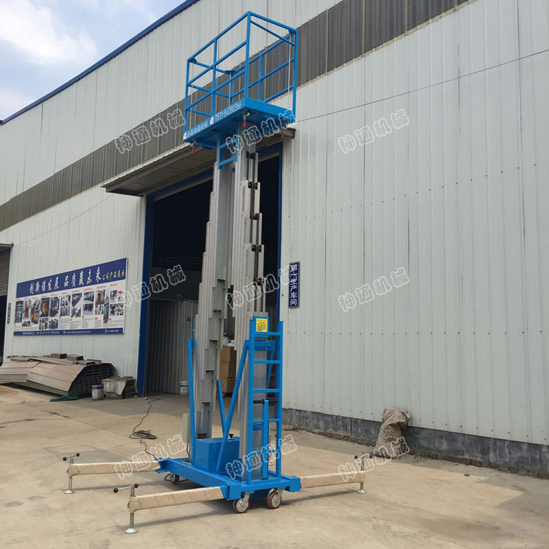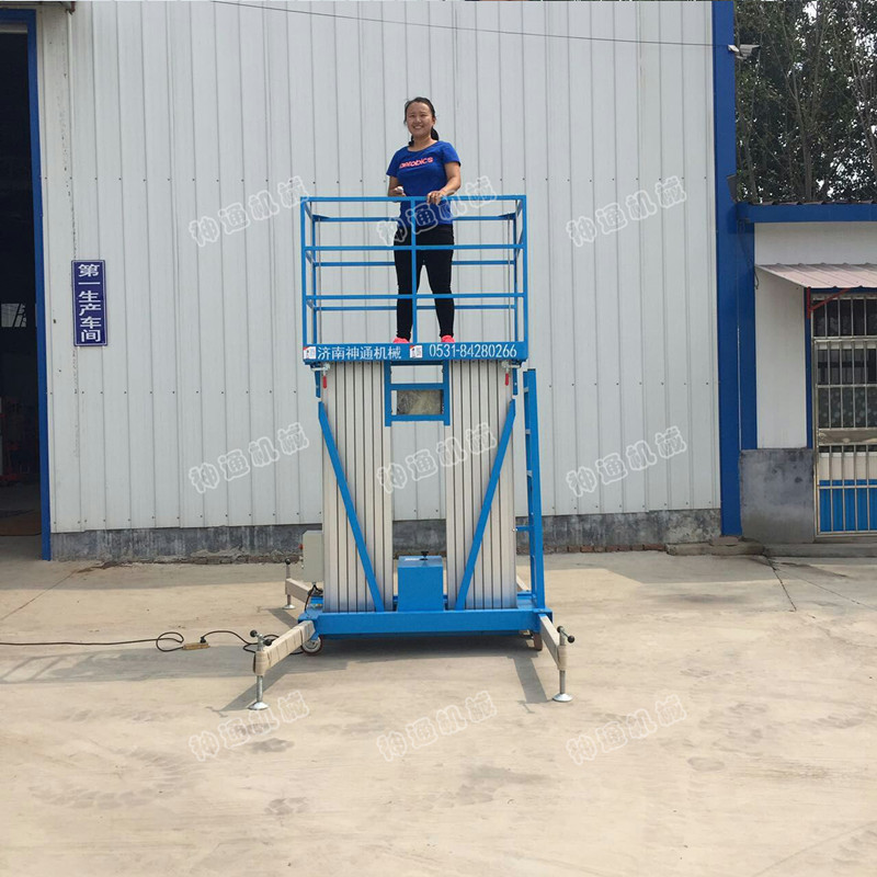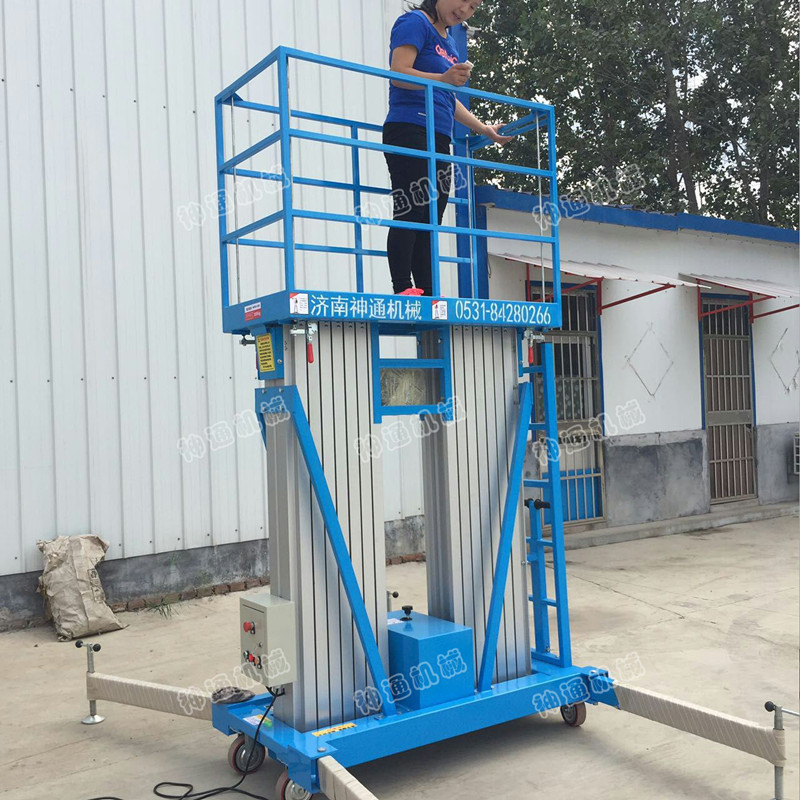 產(chǎn)品介紹:鋁合金電動(dòng)升降機(jī),采用高強(qiáng)度優(yōu)質(zhì)鋁合金材料,具有造型美觀、體積小、重量輕、運(yùn)轉(zhuǎn)靈活,推行方便。升降平穩(wěn)、安全可靠等優(yōu)點(diǎn)。SJYL三柱鋁合金液壓升降平臺(tái)能穿越一般門廳,可隨意進(jìn)出電梯,能在極小的空間內(nèi)發(fā)揮最高的舉升能力。使單人高空作業(yè)變得輕而易舉。且耗電少、無(wú)污染、工作時(shí)不傷地面,可用于貼墻作業(yè)及探出作業(yè)。鋁合金液壓升降平臺(tái)分為:?jiǎn)沃?、雙柱、三柱和四柱等。